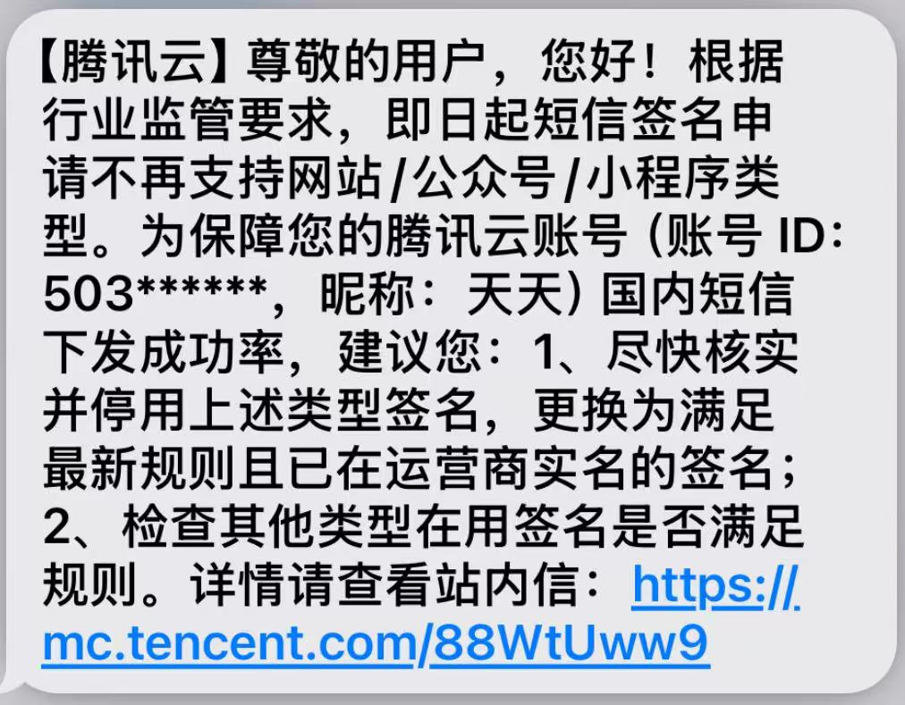【腾讯云】尊敬的用户,您好!根据行业监管要求,即日起短信签名申请不再支持网站/公众号/小程序类型。为保障您的腾讯云账号(账号 ID:503******,昵称:天天)国内短信下发成功率,建议您:1、尽快核实并停用上述类型签名,更换为满足最新规则且已在运营商实名的签名;2、检查其他类型在用签名是否满足规则。